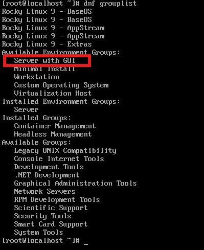 1 | [root@localhost ~]# dnf groupinstall "Server with GUI" |