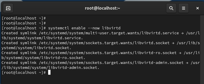 1 | [root@svr1 ~]# systemctl enable --now libvirtd |