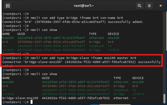 1 | [root@svr1 ~]# nmcli con add type bridge-slave ifname ens160 master br0 |