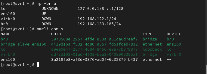 1 | [root@svr1 ~]# nmcli con up br0 && nmcli con up bridge-slave-ens160 |