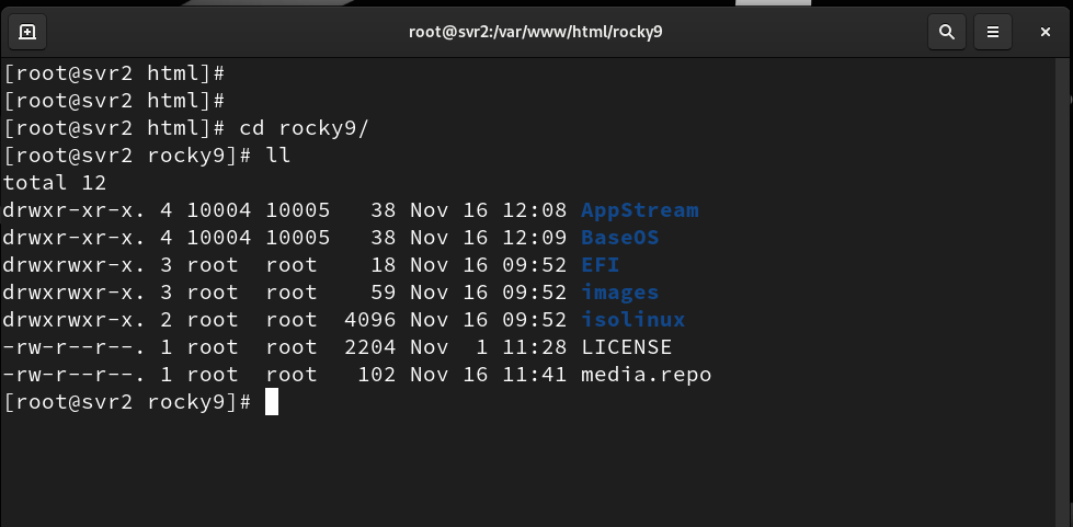 1 | [root@svr2 ~]# cp -av /mnt/* /var/www/html/rocky9/ |