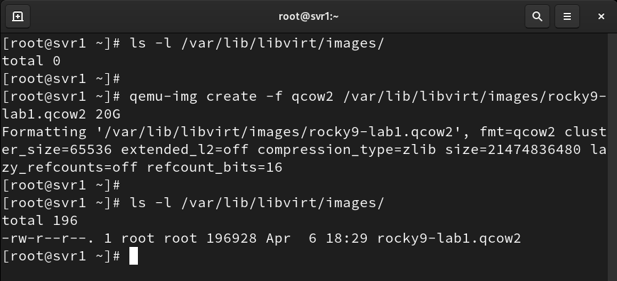 1 | [root@svr1 ~]# qemu-img create -f qcow2 /var/lib/libvirt/images/rocky9-lab1.qcow2 20G |