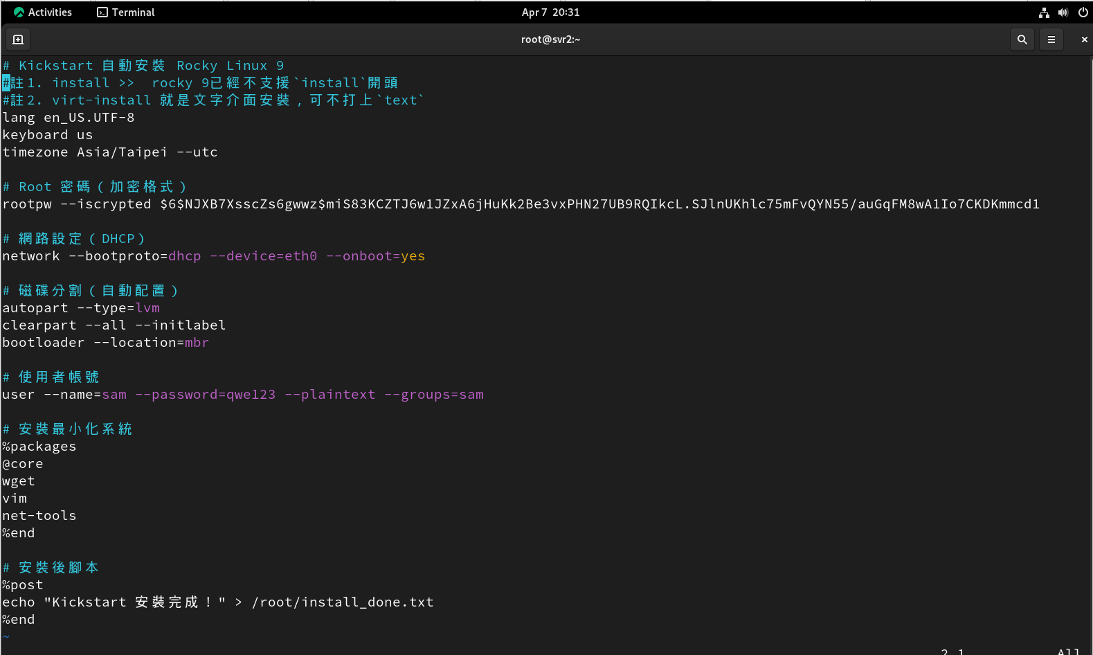 - 在svr2 /var/www/html/ 建立Kickstart 自動安裝檔