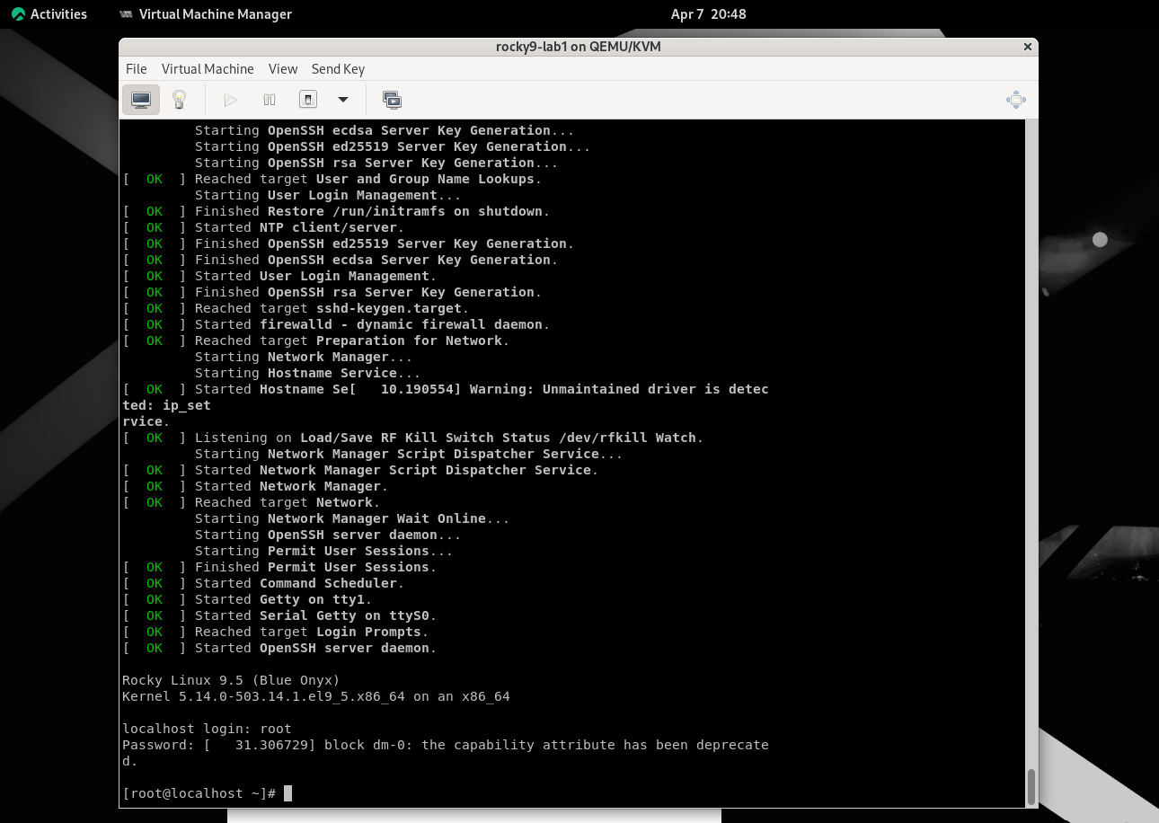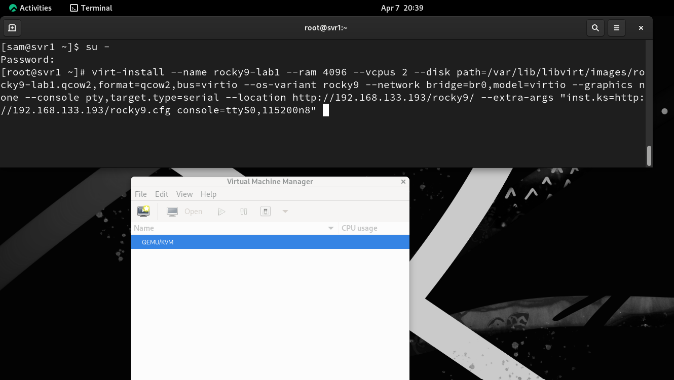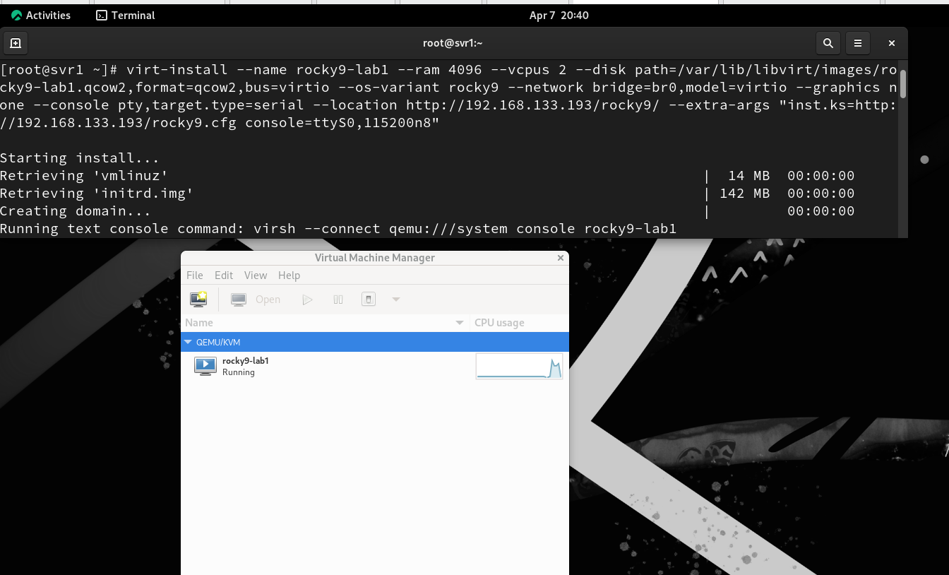 1 | [root@svr1 ~]# virt-install --name rocky9-lab1 --ram 4096 --vcpus 2 --disk path=/var/lib/libvirt/images/rocky9-lab1.qcow2,format=qcow2,bus=virtio --os-variant rocky9 --network bridge=br0,model=virtio --graphics none --console pty,target.type=serial --location http://192.168.133.193/rocky9/ --extra-args "inst.ks=http://192.168.133.193/rocky9.cfg console=ttyS0,115200n8" |